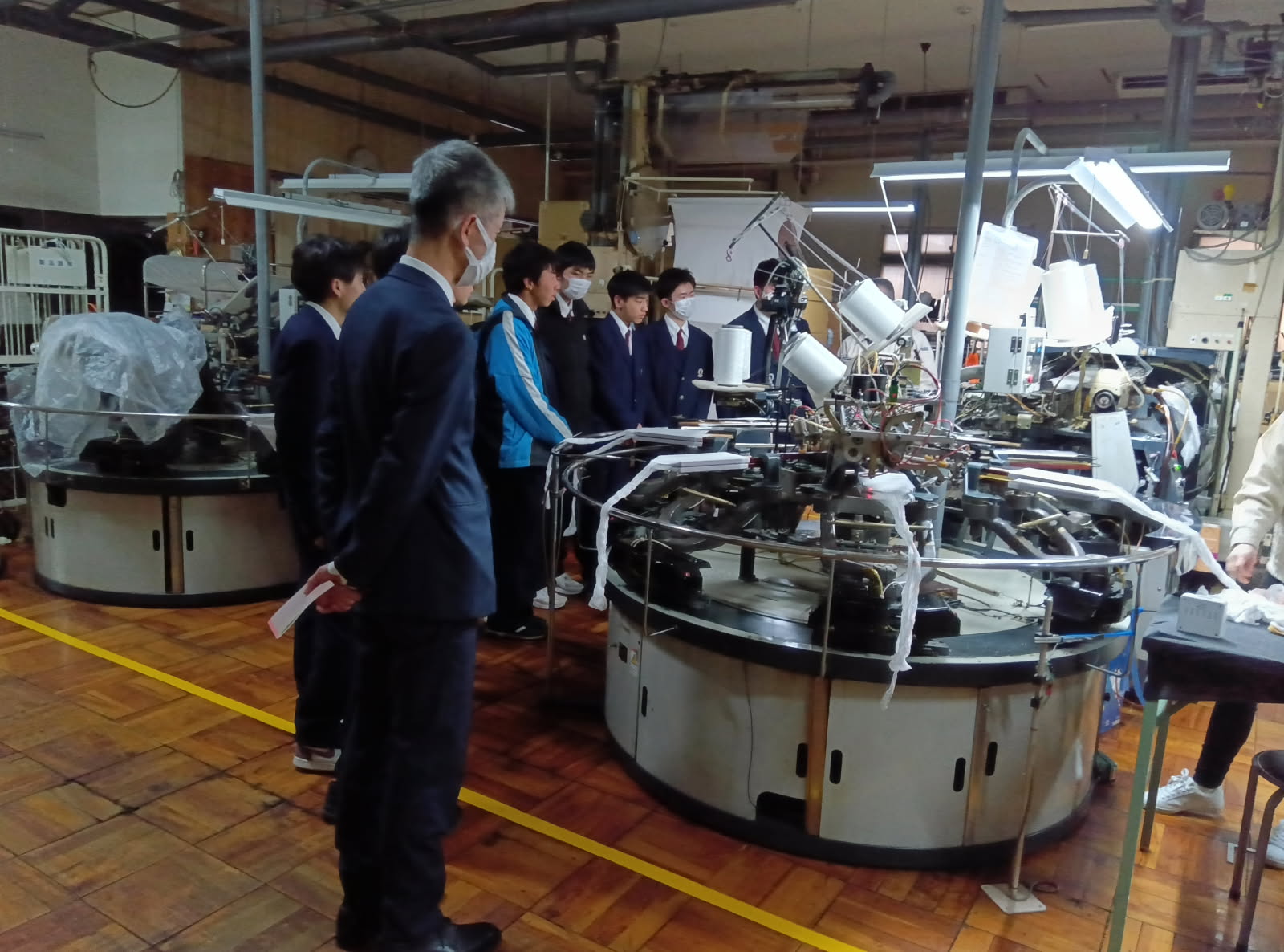 今回の工場見学会は3年生からスタートする就職活動をまえに、実際に働いている現場をみることで 就職に対する理解をより深めてもらおうと奈良県産業部が企画したイベントで、当社には初めての来社となりました。プロジェクターによる会社概要等の説明のあと、4つの班に分かれて工場内の見学ツアーを行い、生徒さん達は普段は目にすることがない編立機や自動縫製機の動きに驚嘆しながら見入っていました。